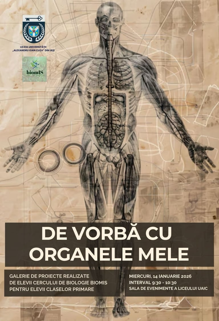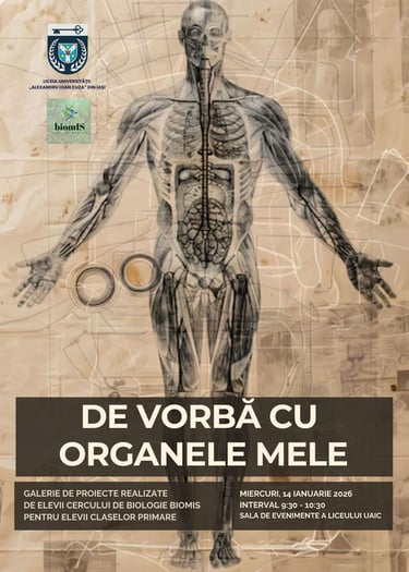 Activitatea „De vorbă cu organele mele” s-a desfășurat în cadrul cercului de biologie, unde elevii au lucrat în echipe de câte doi pentru a realiza proiecte și machete despre organele corpului uman. Aceștia au avut ca provocare adaptarea informațiilor științifice într-un limbaj simplu, atractiv și ușor de înțeles pentru colegii lor din clasele primare (7-9 ani).