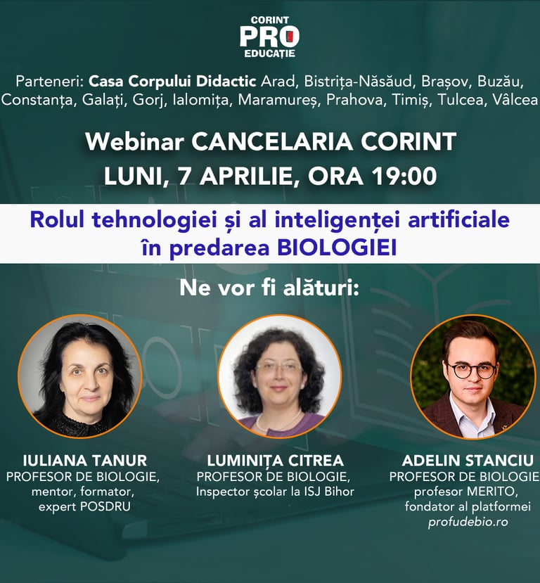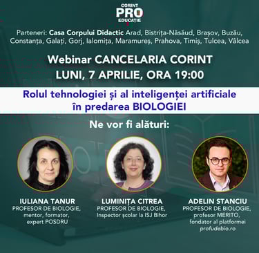 În cadrul webinarului ”ROLUL TEHNOLOGIEI ȘI AL INTELIGENȚEI ARTIFICIALE ÎN PREDAREA BIOLOGIEI” oferit de Corint Educațional, din 7 aprilie 2025, am prezentat o serie de platforme și aplicații utile pentru predarea biologiei, bazate în special pe inteligență artificială.