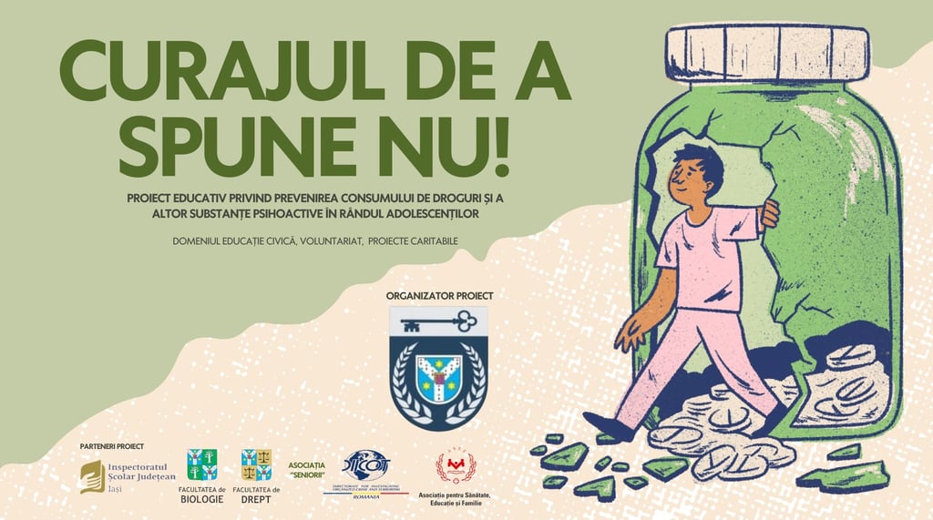 Proiectul județean „Curajul de a spune nu!”, înscris în calendarul activităților educative prin decizia ISJ 33/08.01.2025, poziția 93, inițiat de Liceul Universității „Alexandru Ioan Cuza” din Iași, vizează conștientizarea reală a adolescenților și tinerilor din unitățile de învățământ din județul Iași privind factorii de risc, precum și modul cum se pot proteja de tentația consumului de droguri sau de alte substanțe psihoactive. Informațiile sunt validate din punct de vedere științific de către partenerii noștri: Direcția de Investigare a Infracțiunilor de Criminalitate Organizată și Terorism - D.I.I.C.O.T., Facultatea de Drept și Facultatea de Biologie ale Universității „Alexandru Ioan Cuza” din Iași, Asociația ASEF, psihologi, medici, specialiști din domeniul juridic și al științelor biomedicale.
