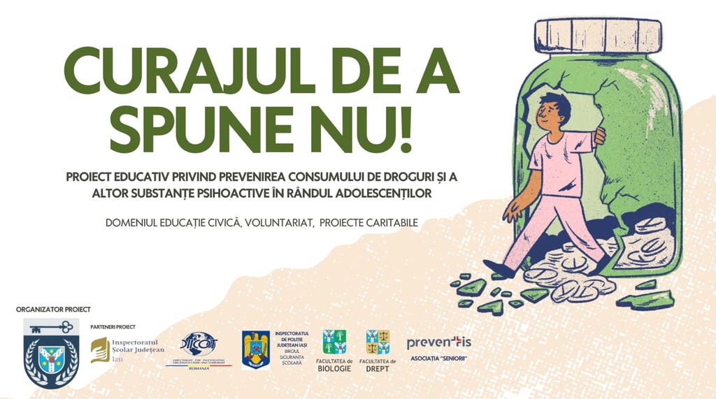 Proiectul județean „Curajul de a spune nu!”, înscris în calendarul activităților educative la nivelul județului Iași, inițiat de Liceul Universității „Alexandru Ioan Cuza” din Iași, vizează conștientizarea reală a adolescenților și tinerilor din unitățile de învățământ din județul Iași privind factorii de risc, precum și modul cum se pot proteja de tentația consumului de droguri sau de alte substanțe psihoactive. Informațiile sunt validate din punct de vedere științific de către partenerii noștri: Direcția de Investigare a Infracțiunilor de Criminalitate Organizată și Terorism - D.I.I.C.O.T., Inspectoratul de Poliție Județean Iași - Biroul de Siguranță Școlară, Facultatea de Drept și Facultatea de Biologie ale Universității „Alexandru Ioan Cuza” din Iași, Asociația ASEF, Asociația Preventis, psihologi, medici, specialiști din domeniul juridic și al științelor biomedicale.