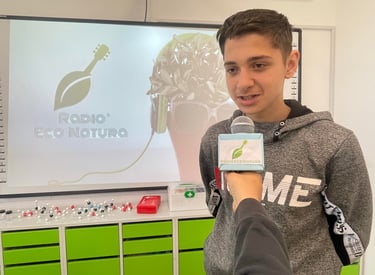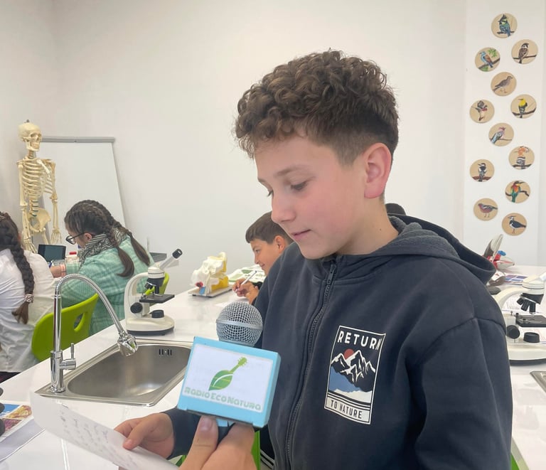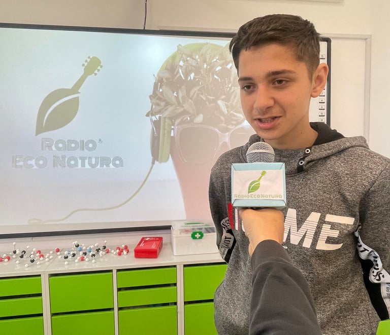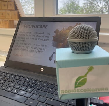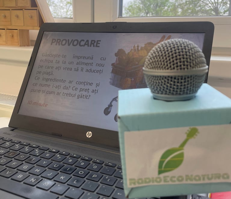 Îți prezint, așadar, o activitate pe care eu am implementat-o în acest an școlar, într-o zi tare ploioasă, în care n-am putut ieși cu elevii în parc sau la pădure pentru identificat specii de plante și animale. A trebuit să găsesc rapid o alternativă, cu materiale puține, de impact, care să placă elevilor și mai ales să urmărească dezvoltarea unor competențe. Am găsit prin casă un microfon (dar tu îl poți înlocui cu orice altceva - un tub de antiperspirant, de exemplu, sau o sticlă de apă etc.), l-am înfășurat într-o cutie de carton incripționată cu titlul activității ”Radio EcoNatura” și am început să prezint elevilor mei pașii de urmat. Pare că și există un post de radio cu această denumire, inițiat de o asociație non-guvernamentală care realizează online emisiuni radiofonice și prezintă știri despre mediu. Tu poți denumi cum dorești: Radio Bio VIII (sau cu orice alt număr, ce indică numele clasei), Radio Clorofila sau Radio Verde, de exemplu.